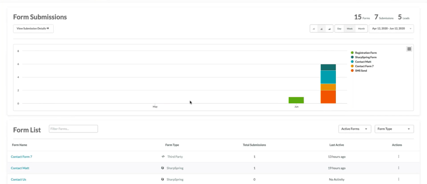 In the navigation section, forms will be underneath the marketing side in the content section. When you click on ‘Forms’ you will be taken to the form submission reporting. This is a great place to keep track of your form submissions once they have been filled out. From here, you can see which forms are getting the most submissions from your leads. There are several graph options you can view to get the data on all your submissions. You also get to see which of your forms are currently active.Â