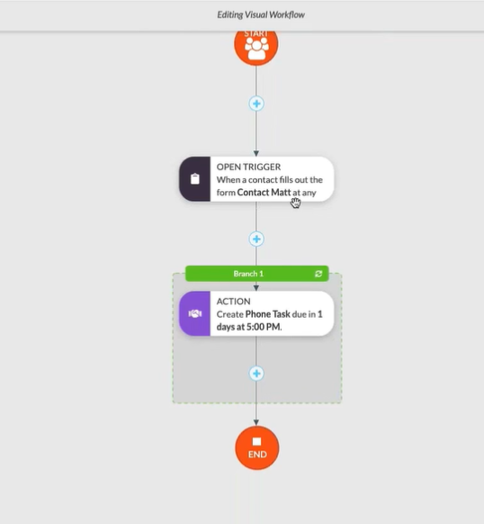 You can connect your form to your visual workflow. For this example, the trigger will occur when a contact fills out the form. The action taken will be the creation of a phone task due the next business day. This allows you to get back to your lead in good time. When you do this, the task will reflect in the form builder automatically, where you will see that you need to make a phone call to the lead.Â