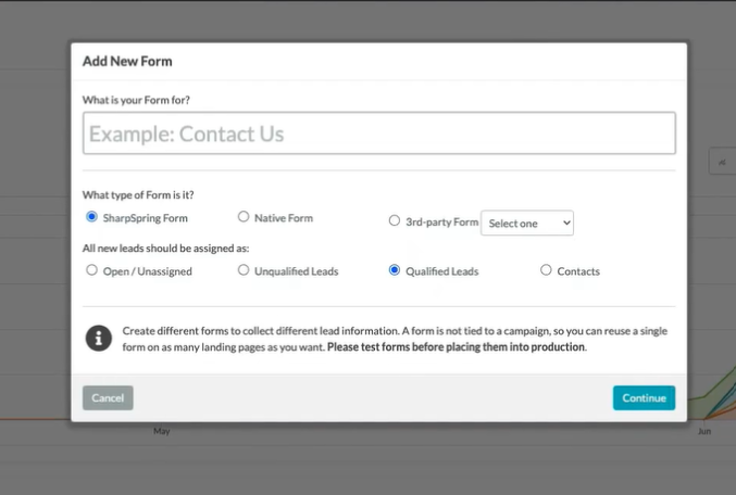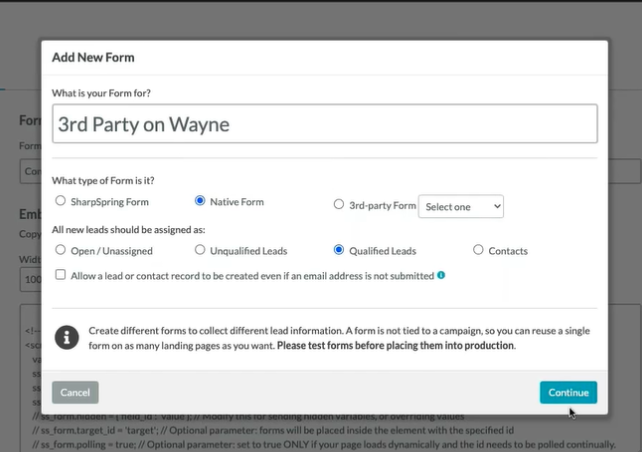 On the upper right, click on ‘Create Form’ to create a new form. It will first ask you to name your form. You will then choose the type of form you want to generate. You have three options here: a SharpSpring form, a native form, or a 3rd party form. You will also need to choose what your leads should be assigned as. This will be based on the strategy of your form. The “Contact us” form is a common example of standard qualified lead forms. You might want to have your sales form assigned under ‘Qualified leads’ because you need to know when you get new leads.