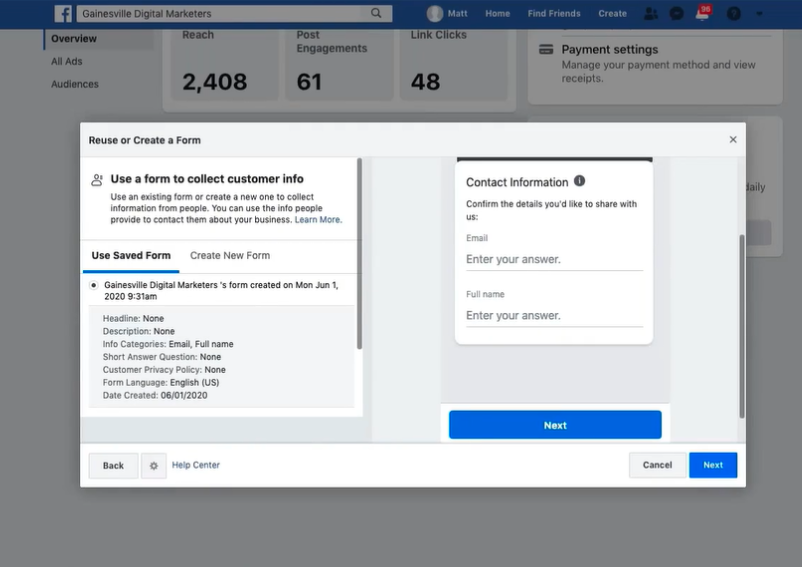 Here is an example of a form on Facebook and the information coming into the Munro Agency account under campaign insights.Â