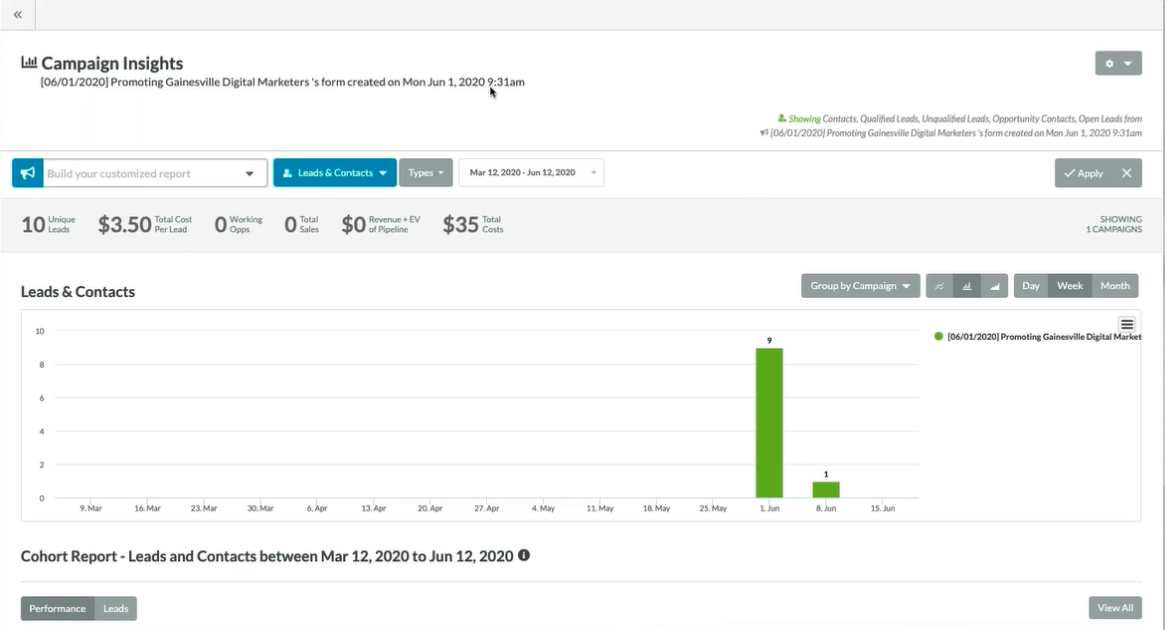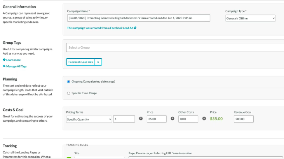 The tag that we integrated into Facebook for these campaigns is the ‘Facebook Lead Ads’ tag. If you have connected 10 different lead ads, you can run campaign analytics on the individual Lead Ads and you can also run analytics based on the tag. This will give you the aggregate of all the performances of your leads Ads.Â