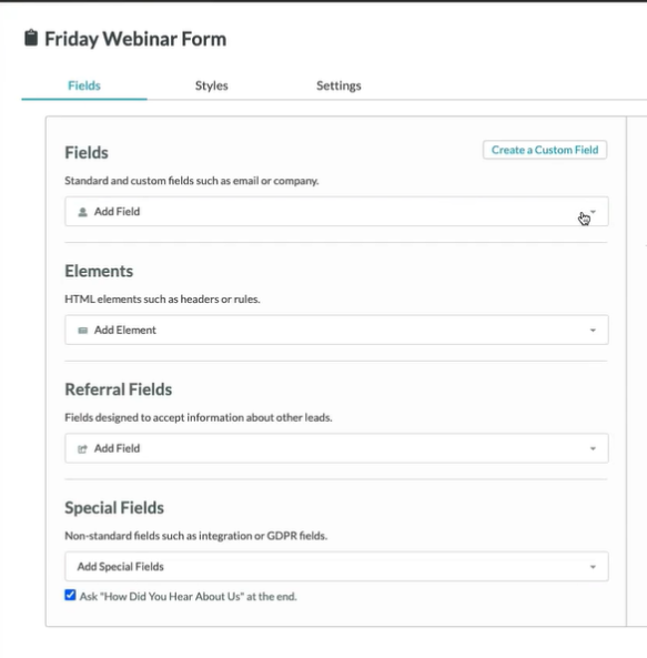 You can add custom fields in your form and this is where having a plan for your custom fields becomes useful. You can have a drop-down list for your custom fields where people can choose from any o the available options. You can also add things like HTML elements, such as a header, to your form.