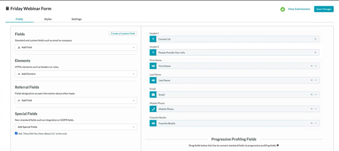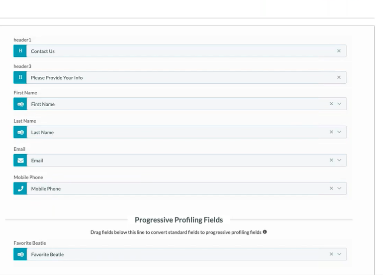 One of the most useful features of this form builder is the progressive profiling field. This feature allows you to control the tempo at which you are requesting information. You can take any of your created fields on the form and drop them into the progressive profiling section. What this does is that when a new lead visits your page, they will fill the first basic fields.