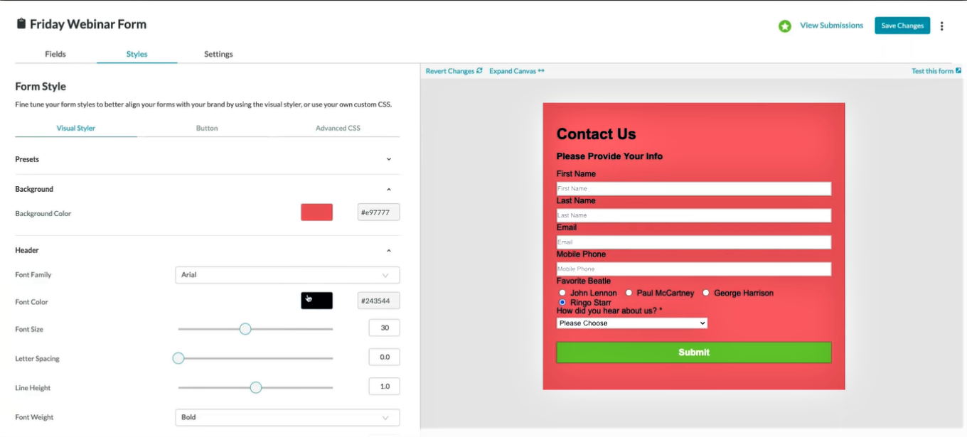 The form styler allows you to change the style of the form without needing to upload your own CSS file. You can link it up to any CSS file you have and then will also have the option to use the visual styler under the advanced settings. This allows you to see what the form will look like when it is done.Â