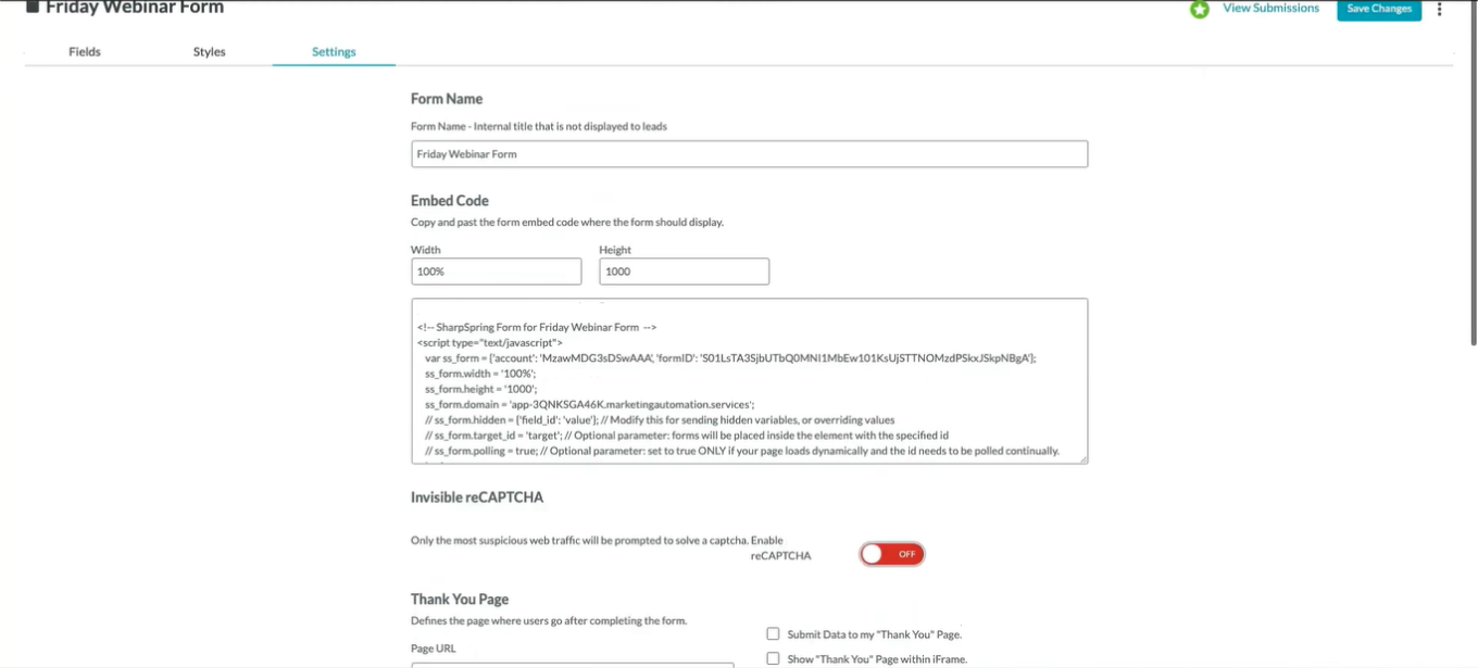 This tab has all the general settings related to your form. You can change your form name and your form dimensions from here. You can also grab your embed code from here when you need it. We have the reCAPTCHA option here, which stops bots and website crawlers from filling your form. You can turn it on by sliding the toggle button.Â