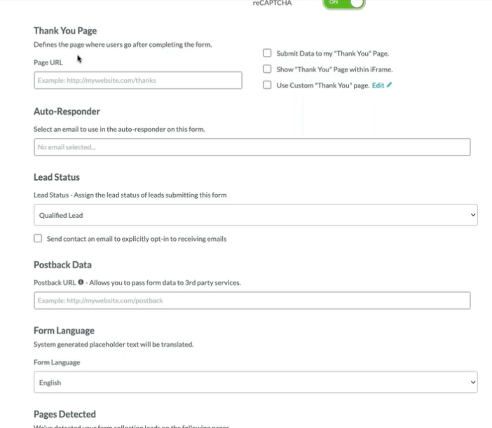 Another option that we have here is the ‘thank you page’. You can add your data to the “thank you” page so that the page can reflect data that was submitted. You can show the ‘thank you page’ directly or you can use a page URL to redirect leads to that page. Under the ‘Auto-responder’, you can add your email to the automation engine to respond to emails that come to you. You can adjust how your leads come in under the ‘lead status’.Â