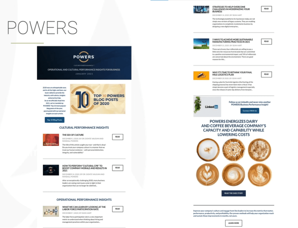 The subject lines are typically non-newsletter-based. They are just pieces of the content that is featured within the newsletter, like a preview. The newsletter comes from the president of the company, which is an uncommon approach that tends to be quite successful. It is a creative way to connect to their audience base to drive better engagement. Here is an example of what this type of newsletter looks like: