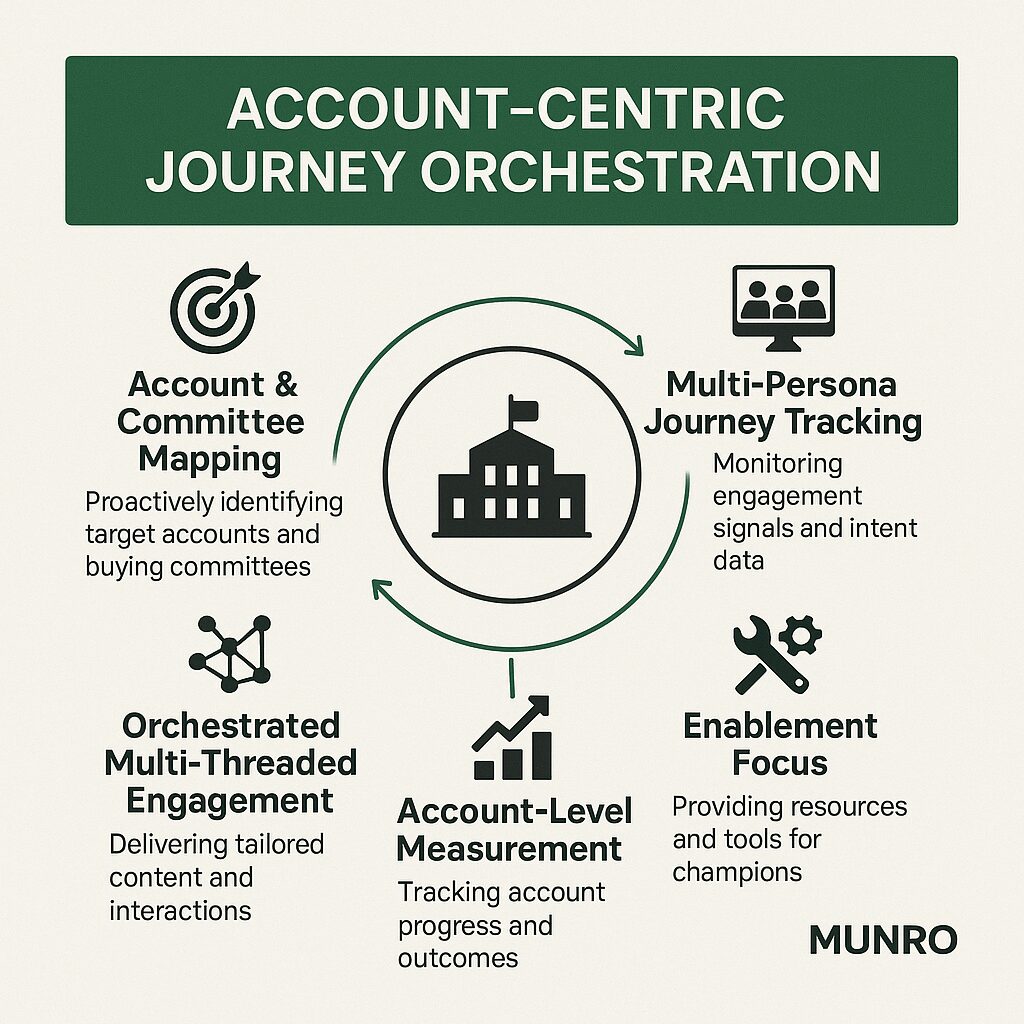 - Account-Centric Measurement: Shift performance measurement from lead-based metrics (MQLs) to account-level engagement, buying committee activation, and journey progression indicators.