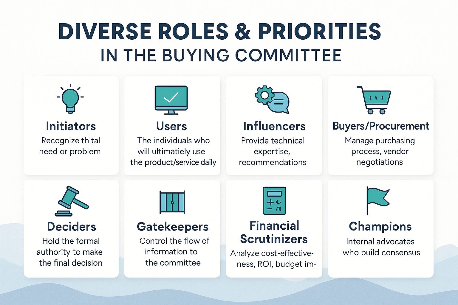 - Champions: Internal advocates who believe in the solution and work to build consensus and push the deal forward.