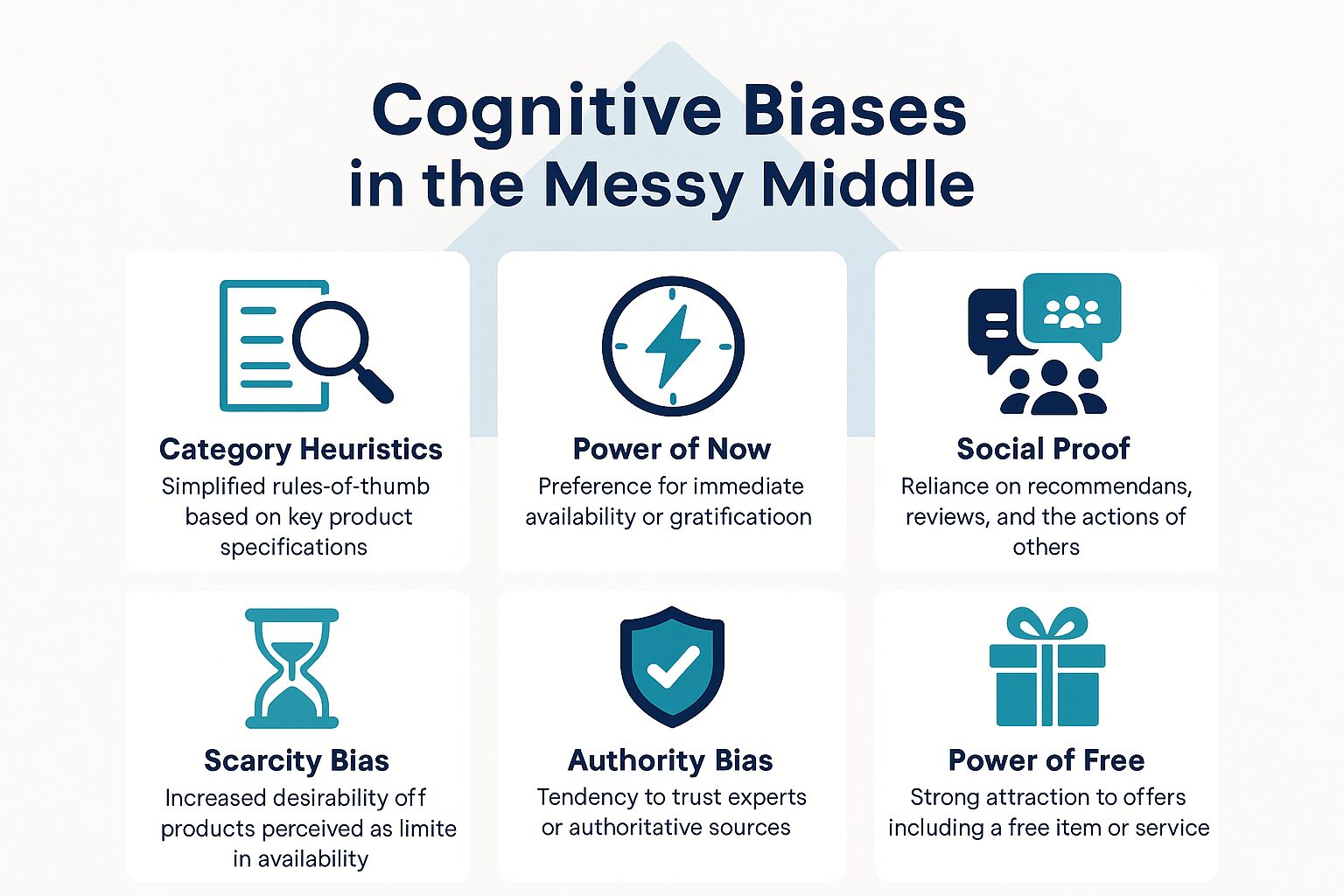 The Role of Cognitive Biases: Consumer navigation through this messy middle is heavily influenced by cognitive biases – mental shortcuts hardwired into human psychology. Google’s research highlighted six particularly potent biases in online purchasing: