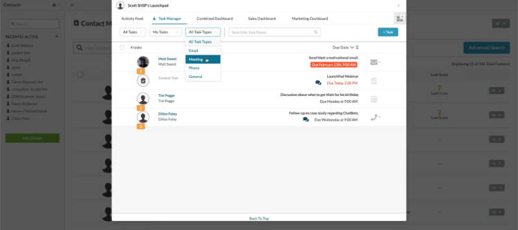 You can create a new task by clicking on the ‘Task’ icon. Once you add the task, it will show up in the task manager. As you can see above, there are other functionalities to the task manager, where you get reminders for overdue tasks like the ‘Due February 13th’ reminder highlighted above. You can complete the task you need to do directly from this section. If you need to complete an email task, for example, you can send out the email from here directly. When you add a task to the task manager and add your email, you will get the tasks placed on your calendar, allowing you to keep track of what you need to do. You can create tasks both for yourself and for other members of your team.Â