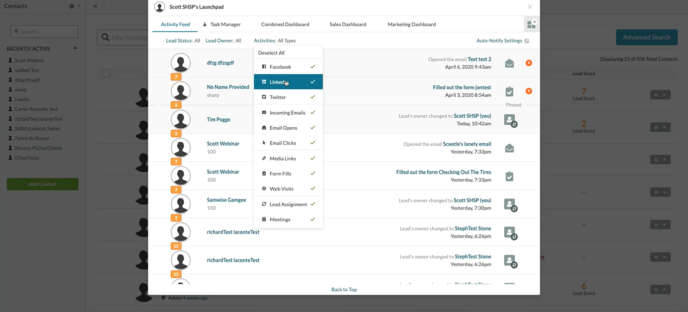 This feature gives you complete visibility of all ongoing engagement with the entire team in real-time. It provides you with a birds-eye view of your active leads for optimal outreach. You get to see when they open emails, view media, visit tracked pages, and so much more. The best thing about this feature is that it allows you to filter on activities so that you can look at what you are most interested in, such as lead assignments, social interactions, or email engagement.Â