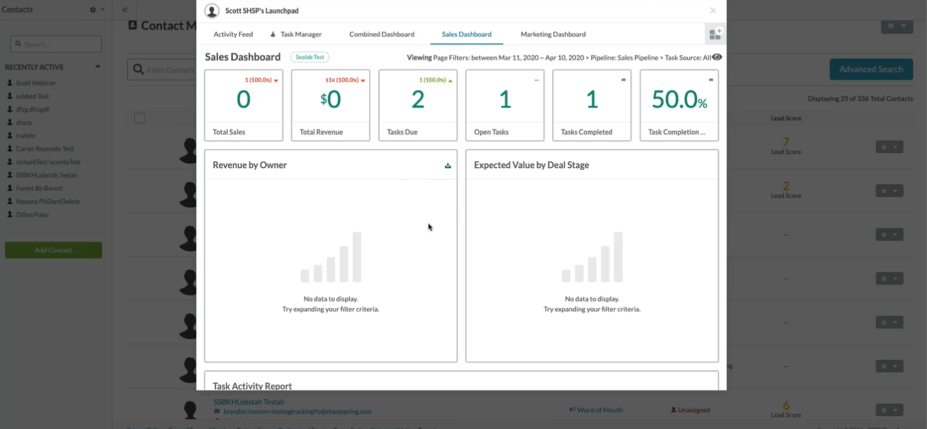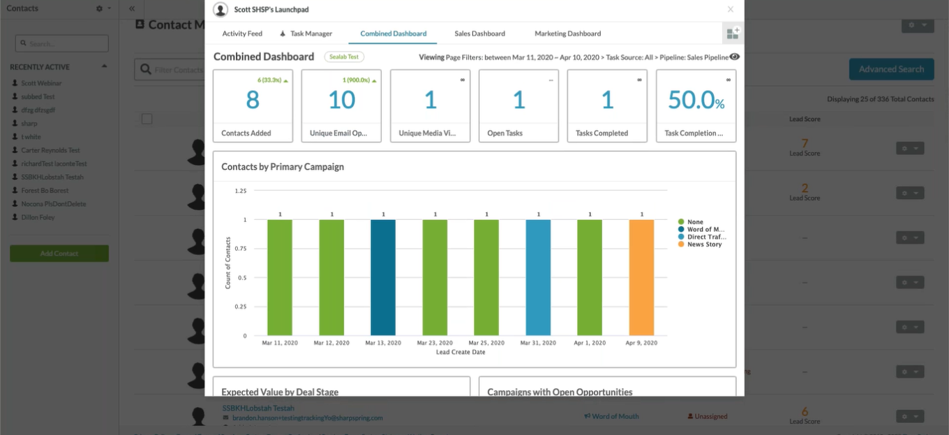 From the combined dashboard, you can see the number of added contacts, completed tasks, open tasks, and other metrics. This is a great report when you are looking to create quarterly reports or annual reports for your team. It is a combination of everything going on in the system. Â