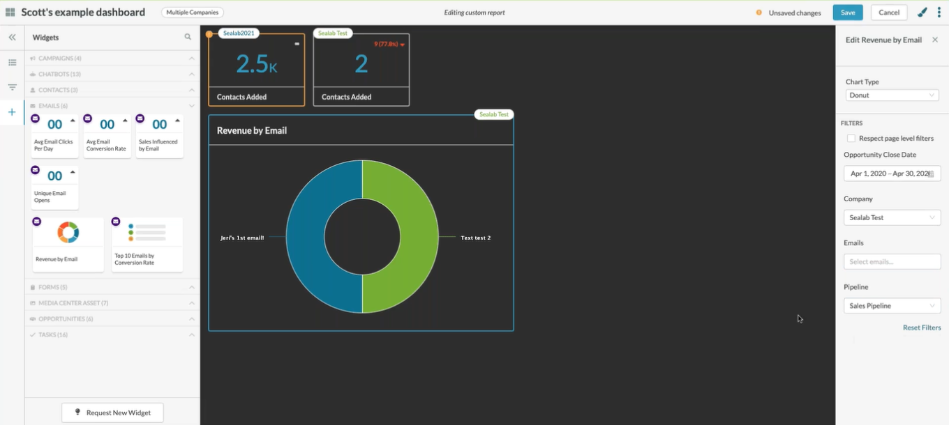 Choose a title for the report and the theme you prefer. There are different widgets that you can use to build your report. They include campaign widgets, chatbox widgets (these allow you to pull in and data from your chats), contact widgets, email widgets, media centre widgets, and opportunity widgets. This interface uses drag and drop to add items to your report. Every widget has a set of parameters that you can set to get the information you want to obtain. You can add multiples of the same widget and sort them out by client accounts. Â