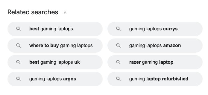 Let’s continue using “gaming laptops,” you’ll see below that one of the related searches is “best gaming laptop.” What you can do here is a listicle of best gaming laptops, and maybe refine it to “in 2023,” “under £1,000,” and so on.