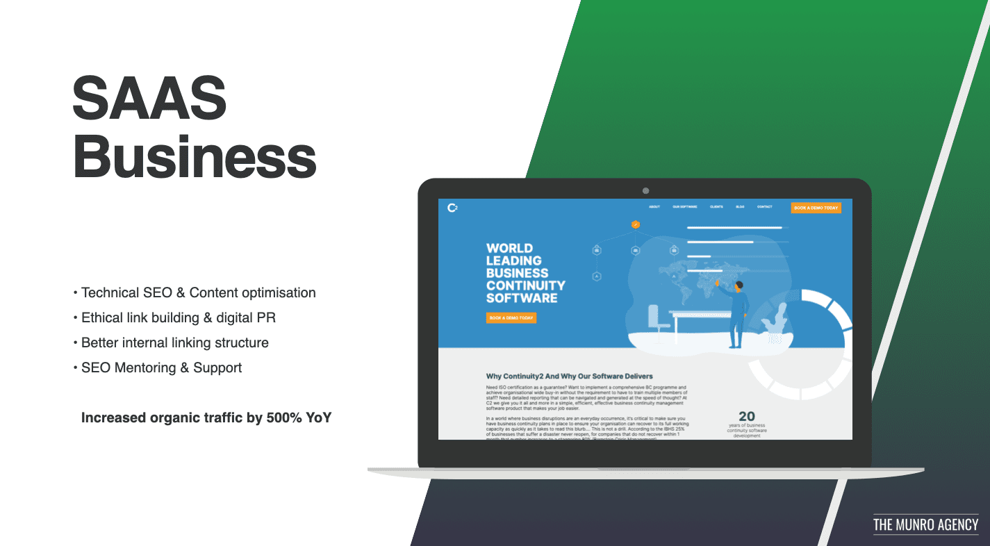 Embark on a captivating journey through this case study, illustrating how The Munro Agency empowered Continuity2 (C2), a resilience and business continuity software provider, to defy the odds, reverse a declining traffic trend, and boost search traffic by an incredible 500% year on year. Witness the transformation as C2’s Google ranking for their crucial money terms soared from a lacklustre position 15 to an enviable position 2. This success story exemplifies how setting clear goals and devising a well-thought-out strategy can propel even the smaller players in a marketplace dominated by cash-rich companies to the forefront. It’s all about delivering a stellar user experience and crafting linkable content.