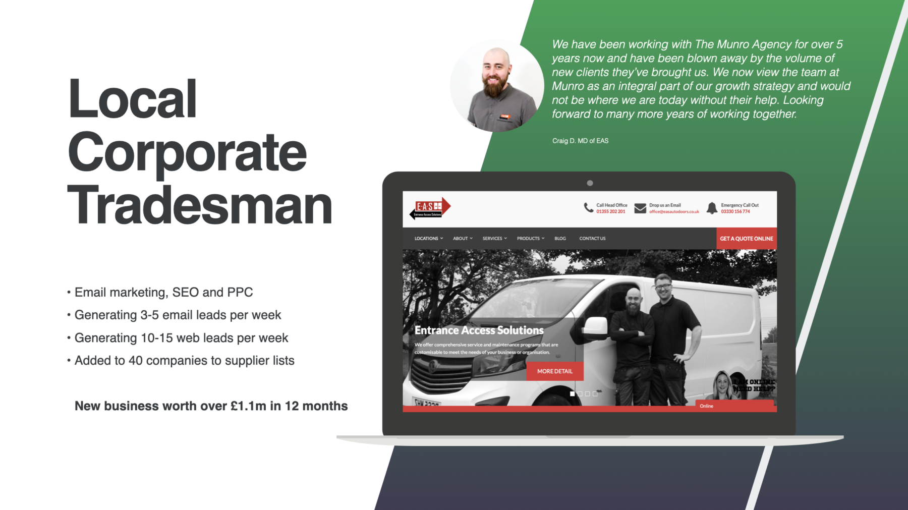 The Munro Agency played a pivotal role in every phase of EAS’s growth trajectory. Our marketing strategies helped EAS to establish a reliable mechanism for driving leads into their business and build a robust online presence. Fast forward five years, EAS still works with The Munro Agency and has over 20 staff, multiple sites, dozens of vans, and contracts with some of the UK’s largest companies.